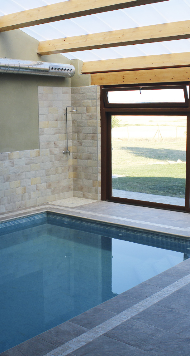 La casa cuenta con una zona de piscina cubierta y 5000 M2 de finca al aire libre distribuidos en jardines, parking, arenero para los más pequeños, un merendero con horno de leña y barbacoa y un aseo.